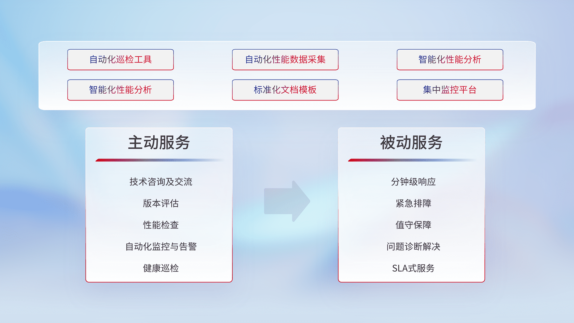 智能化工具和标准化文档,,,,保障服务质量,,,提供主动服务(包含技术咨询、、、版本评估、、、性能检查、、、、自动化监控与告警、、、、健康巡检)和被动服务包含(分钟级响应、、、、紧急排障、、、值守保障、、、、问题诊断解决、、、、SLA服务)。。。