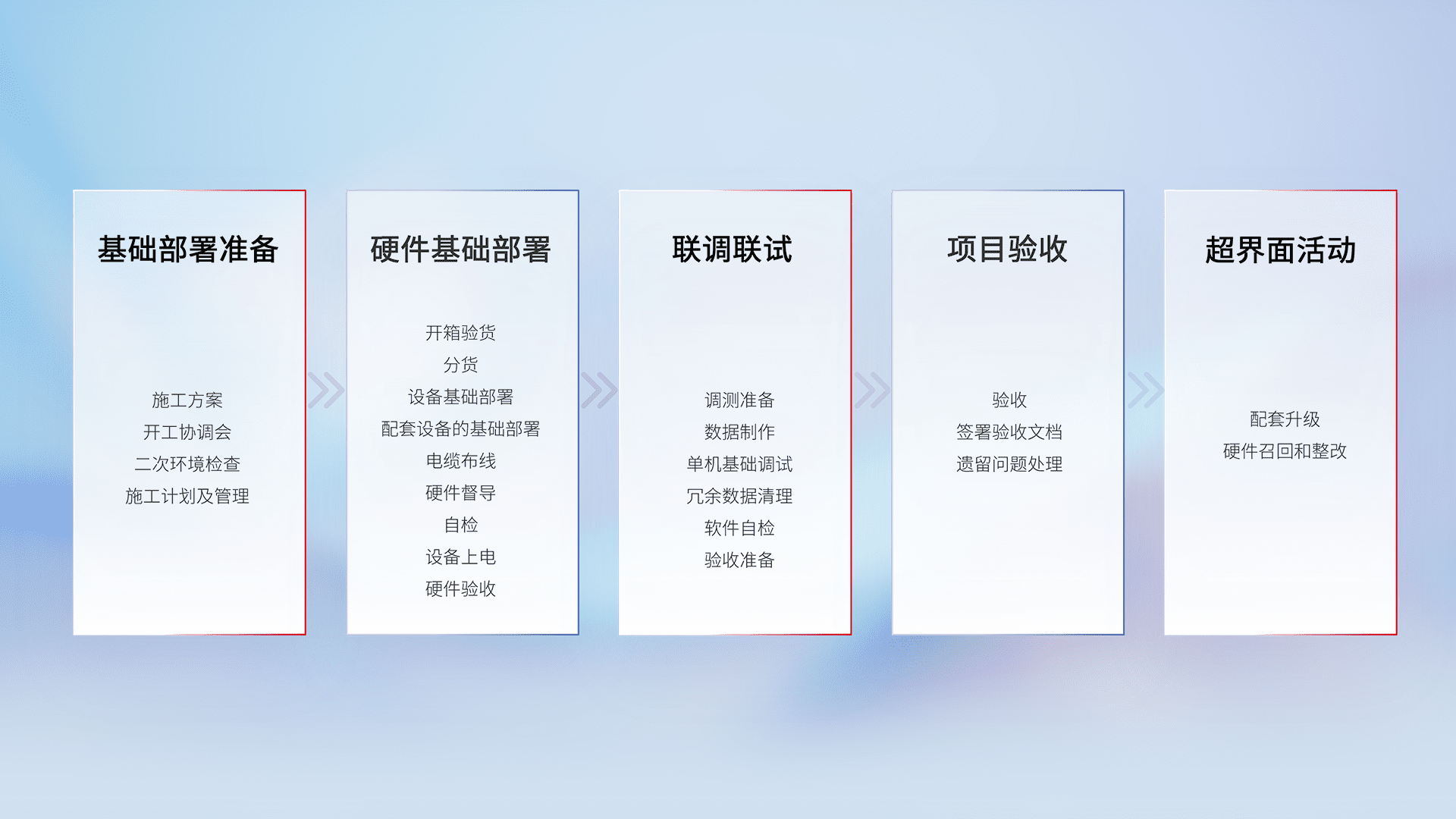 从基础部署准备、、硬件基础部署、、、、联调联试、、、项目验收、、、越界面活动的全过程可追溯,,,,保证施工质量和进度。。。